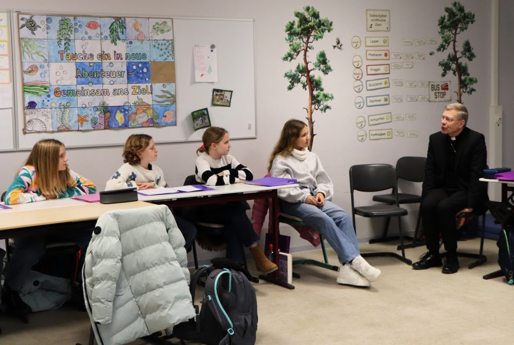 Im anschließenden Austausch mit der Klasse 5a zeigte sich der Weihbischof sehr offen und interessiert an den Anliegen der Schülerinnen und Schüler. Diese nutzten die Gelegenheit, einem Geistlichen einmal ganz persönliche Fragen stellen zu können, deren Antworten man nicht als Standard in Interviews nachlesen kann. Beispielsweise berichtete Weihbischof Zekorn über seine Vorliebe für Wanderurlaube und gab zu, vor großen Gottesdiensten auch manchmal ein wenig nervös zu sein. Auch über Hobbys und vor allem Fußball kamen der Bischof und die Klasse in ein lebhaftes Gespräch, wobei die Aussage zu seinem Lieblingsfußballverein (Schalke) nur bei einem Teil der Klasse auf Gegenliebe stieß.