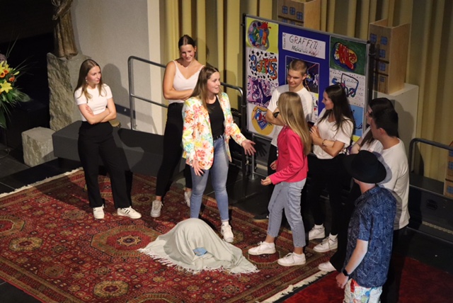 Vor den Sommerferien fand die stimmungsvolle Uraufführung des Theaterstücks „Hannah im Glück“ des Literaturkurses der Q1 statt. Hier kämpften das personifizierte Glück, Schicksal und Zufall um die noch unentschlossene Hannah. Anbei finden Sie einige Impressionen des gelungenen Abends.
